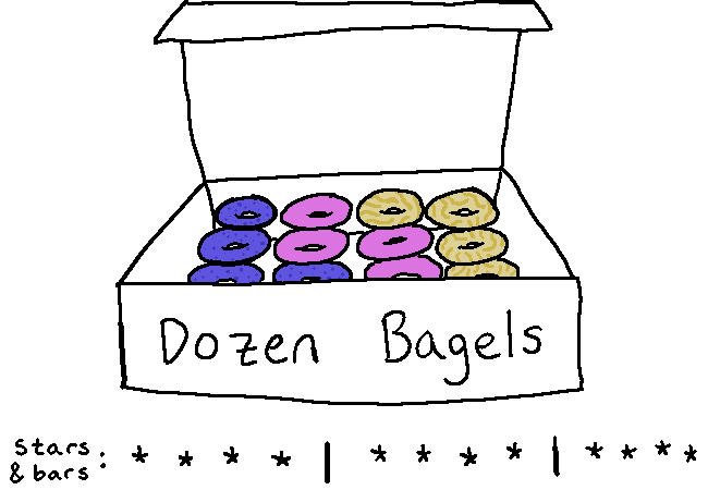 Yes, so the stars represent bagels, and the bars separate the bagels into groups. These groups represent the flavors of the bagels. You should really just watch the video instead of listening to me remember it at you.