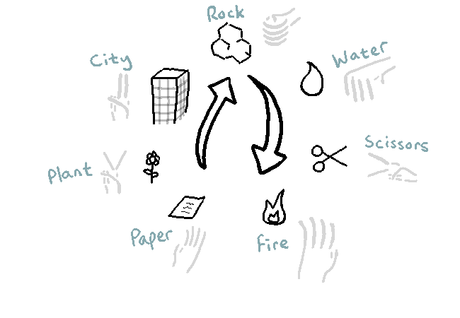 Rock is a fist, water is a downward-facing palm with limp fingers, scissors is a pair of fingers splayed to the side, fire is an upward-facing palm with fingers aimed skyward, paper is a downward-facing palm with level fingers, plant is a pair of fingers splayed upwards, and city is a pair of fingers stuck together aimed skyward.