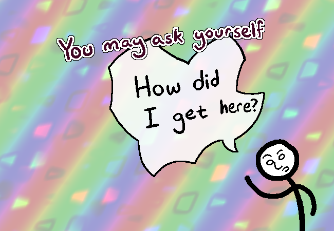 It's a reasonable question to ask. I don't even know where “here” is, let alone how one could manage to travel here. I guess opening GIMP and drawing a bunch of rainbow gradints with multiplication layers, followed by two layers in normal mode, one with a decreased opacity raindow gradient and the next with a solid white tone and further decreased opacity would get the job done.